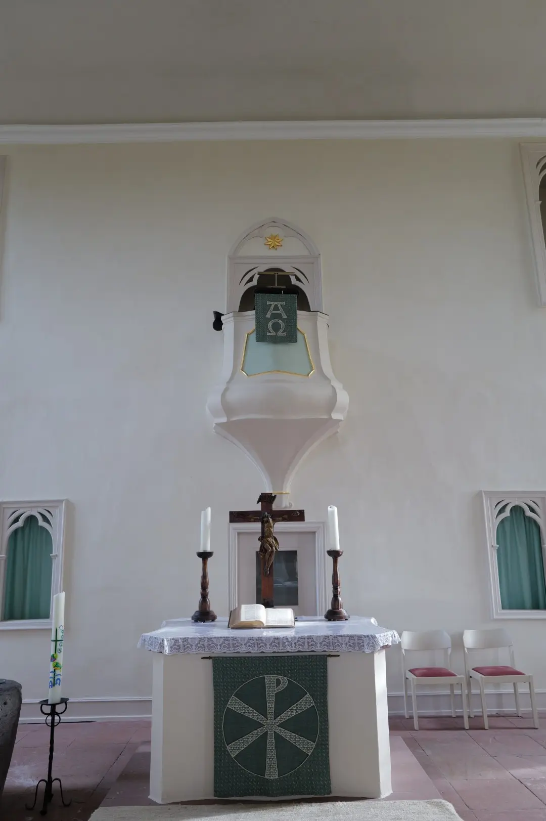 Von den ursprünglich drei Eingängen sind noch zwei in Betrieb. Die Kanzel erhielt